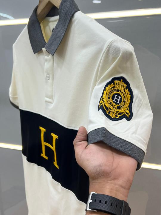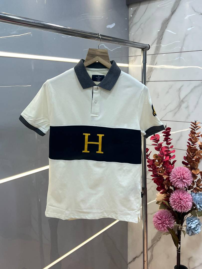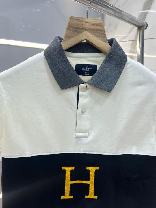 Hacket White Premium Imported Compact Yarn 240 GSM Interlock Fabric Polo Tshirt with Front Design and Embroidered Logo 3700