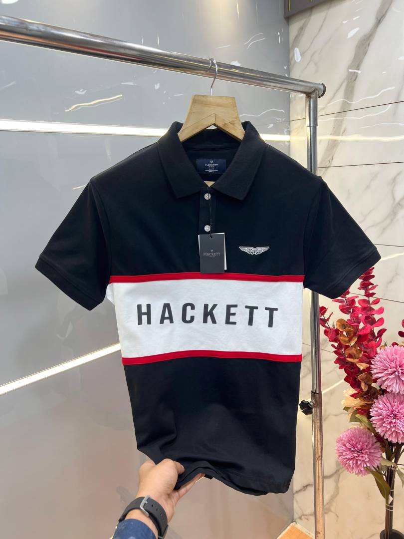 Hacket Black Premium Imported Compact Yarn 240 GSM Interlock Fabric Polo Tshirt with Front Design and Embroidered Logo 3701
