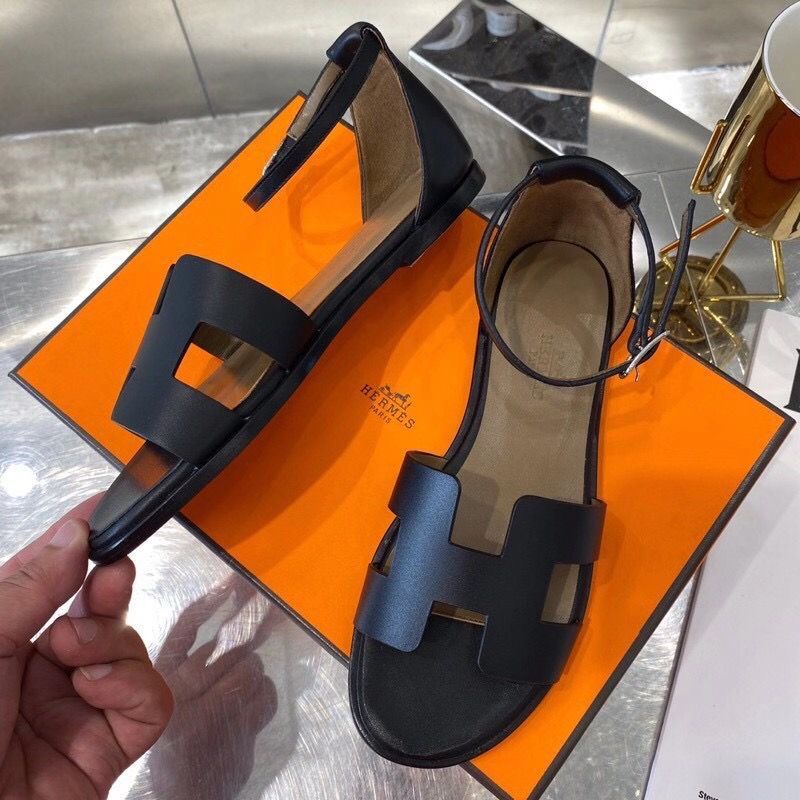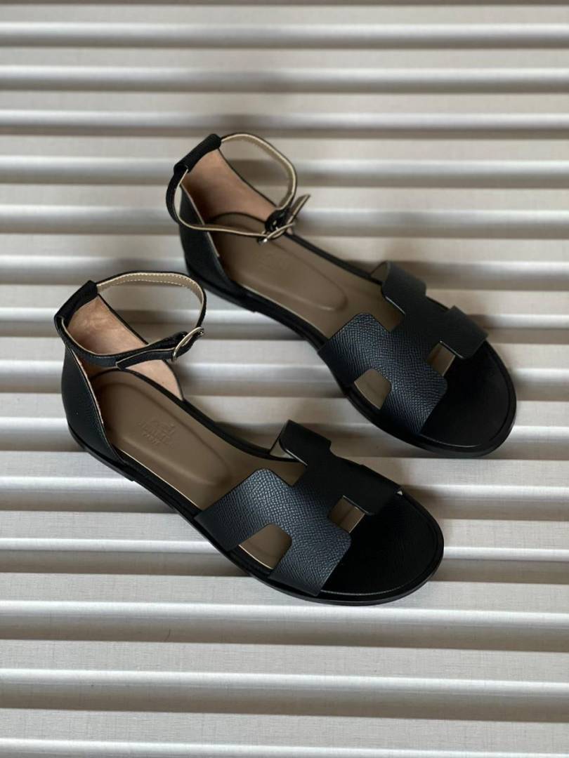 Hermes Santorini Black Flat Sandal With Original Box