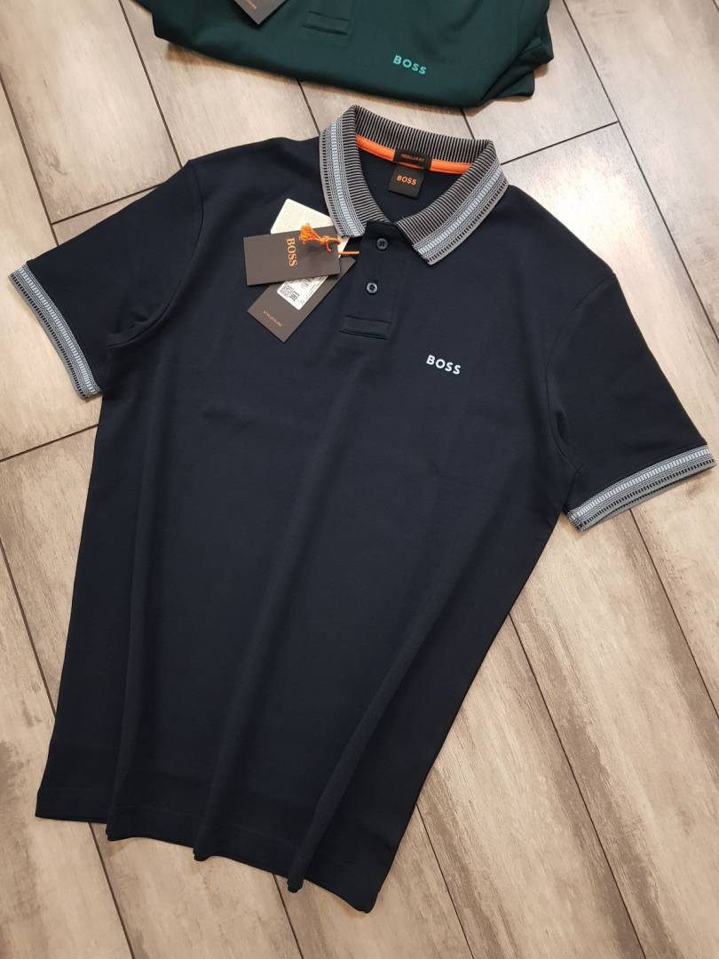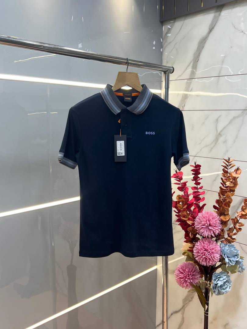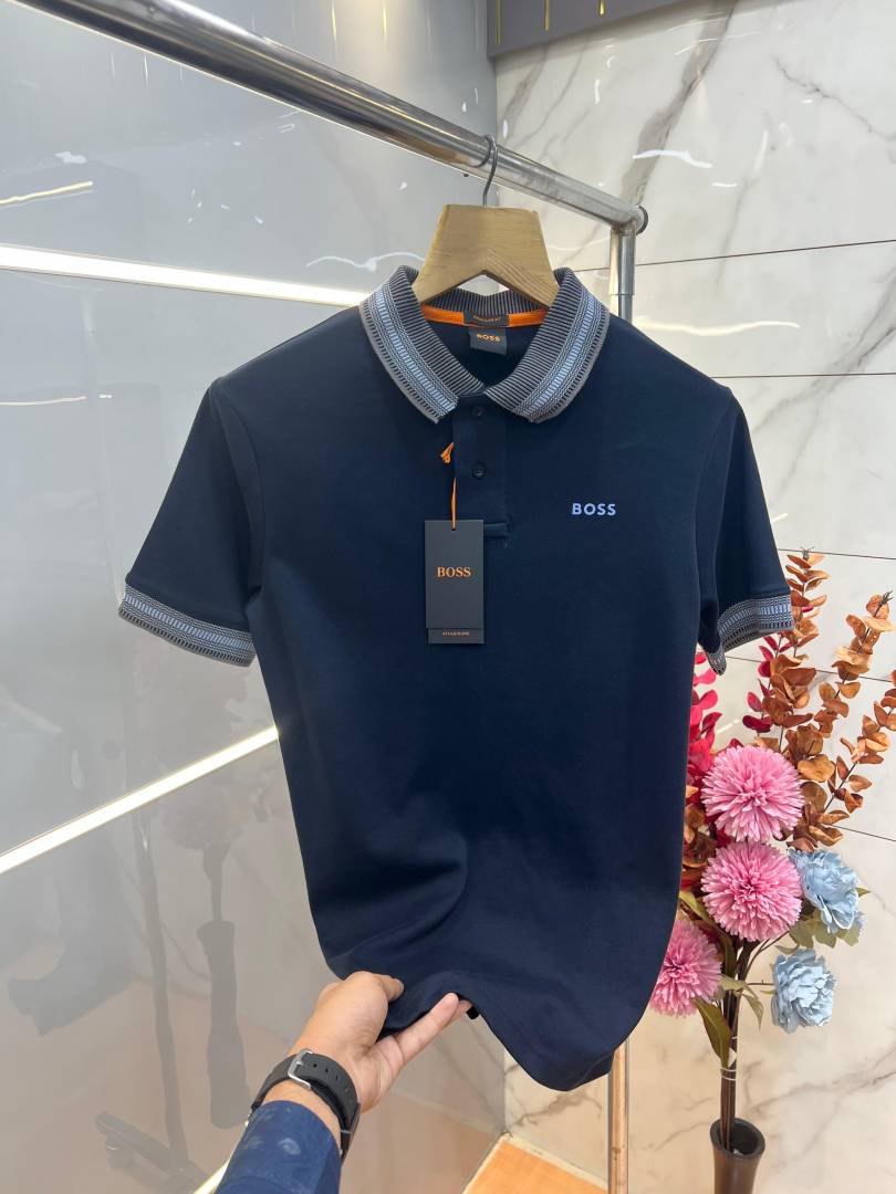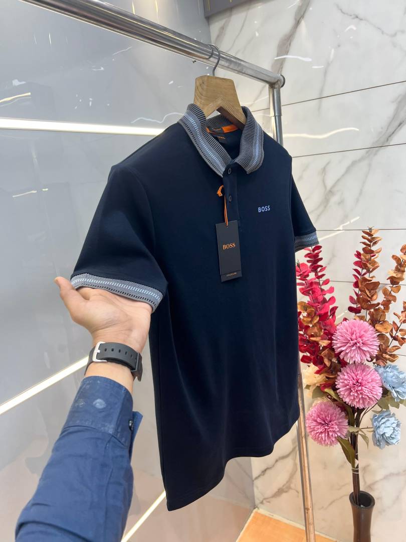 Hugo Bos s Navy Premium Imported Compact Yarn 240 GSM Interlock Fabric Polo Tshirt with Collar Design and Emboss Logo 3694