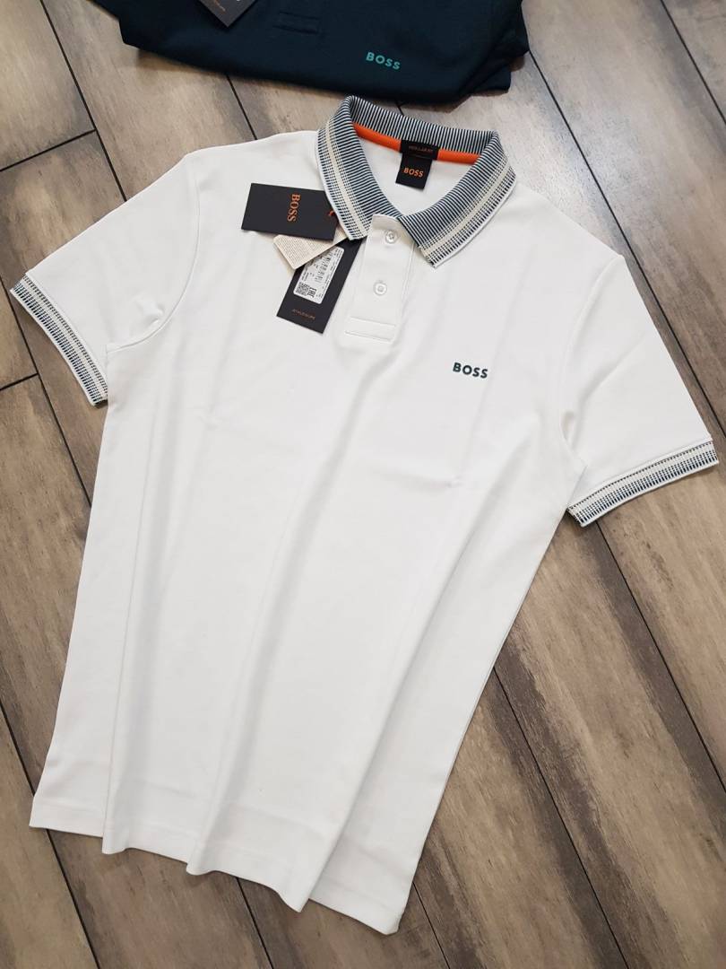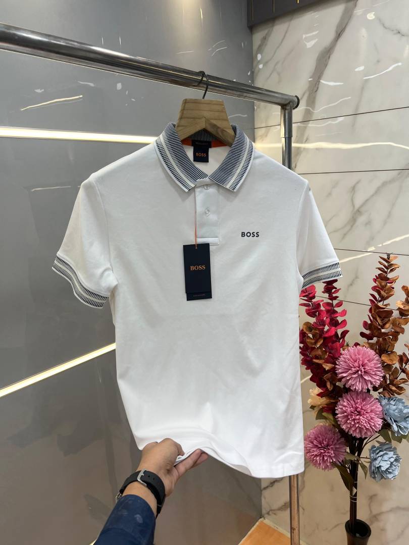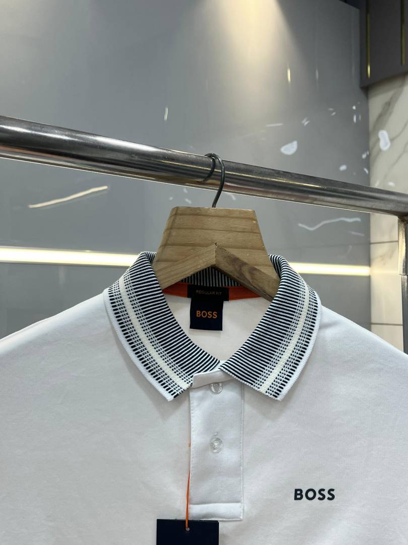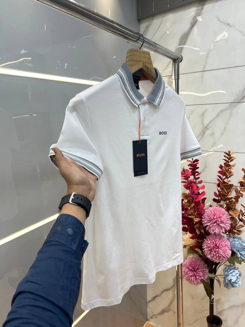 Hugo Bos s White Premium Imported Compact Yarn 240 GSM Interlock Fabric Polo Tshirt with Collar Design and Emboss Logo 3695