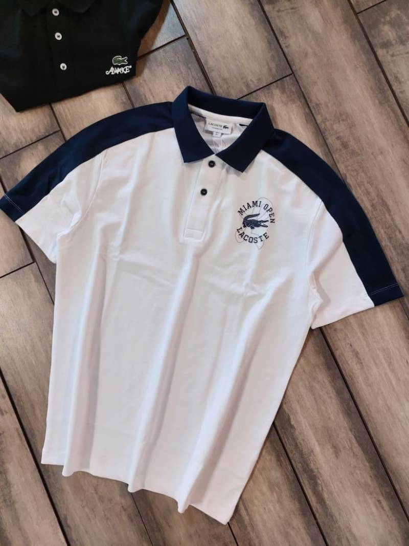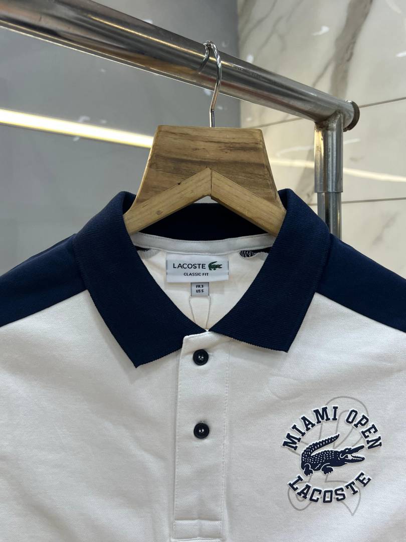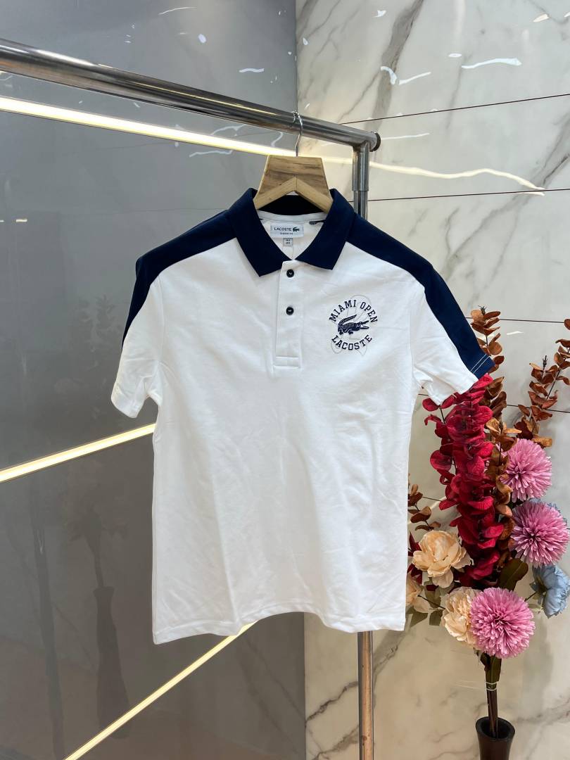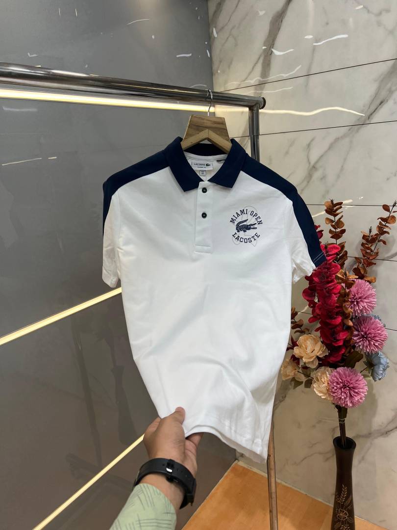 Lacost e White Premium Cotton Pique fabric Polo Tshirt with Shoulder Design and Embroidered Logo 3990
