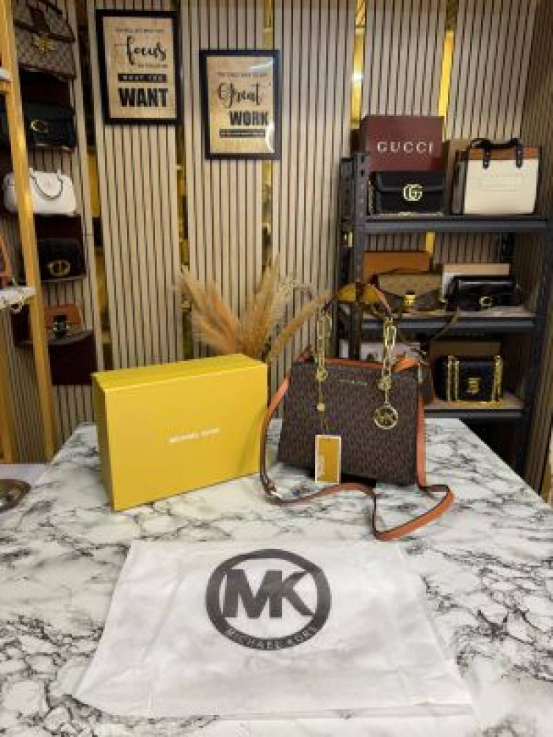 Michael_Kors Cynthia Signature Logo Satchel Bag With Box And Dust Bag (Brown)